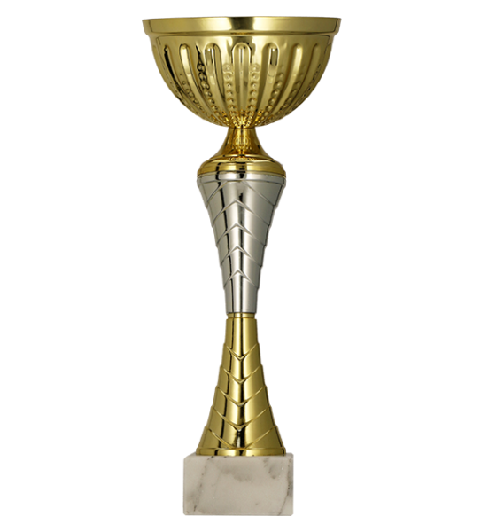 Serie 8126 8 Grössen, gold-silberfarben, Metallcup, Kunststoff, Marmorsockel hell, incl. Gravurschild mit Gravur ( Text und Ziffern )